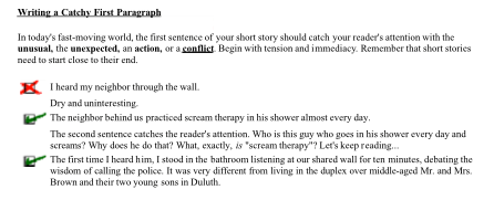 A popular handout from my site, Short Stories: 10 Tips for Creative Writers, includes a phrase uncommon enough that Googling for it (“practiced scream therapy“) leads me to short story exercises that develop an example into more detailed studies, or pages that remix the content of my site in order to make a similar point. Those were fun to read.