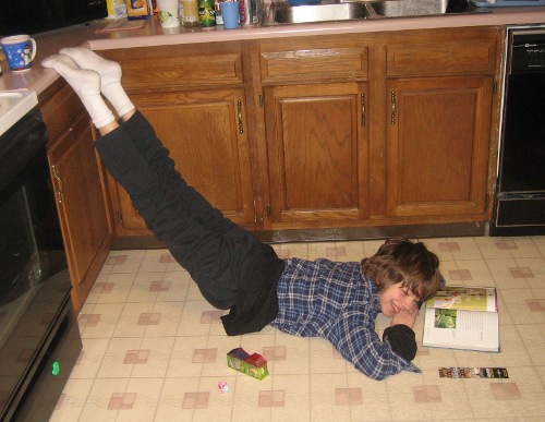 Like most siblings, my kids (age 10 and 6) don’t always get along. But since they’re home-schooled, they spend a lot of time together doing lessons at the kitchen table — or rolling on the ground near the kitchen table… here’s my son reading his geography book: