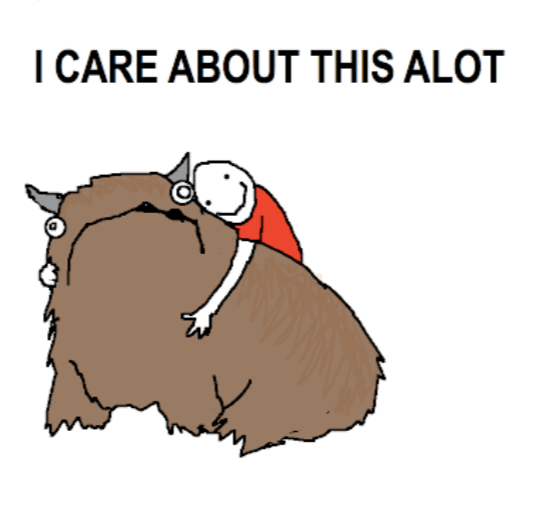 The Alot is an imaginary creature that I made up to help me deal with my compulsive need to correct other people’s grammar. It kind of looks like a cross between a bear, a yak and a pug, and it has provided hours of entertainment for me in a situation where I’d normally be left feeling angry and disillusioned with the world.