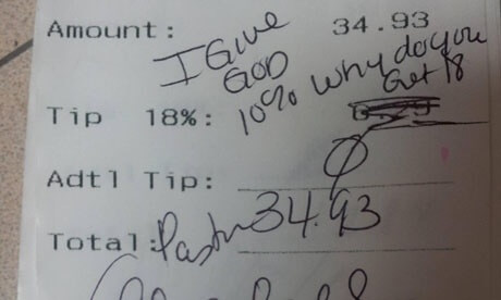 This didn’t even happen at my table. The note was left for another server, who allowed me to take a picture of it at the end of the night. Someone had scribbled on the receipt, “I give God 10%. Why do you get 18?”