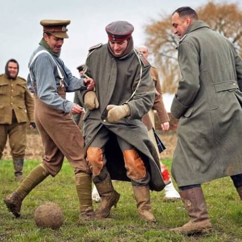 Men in authentic period uniforms of the Lancashire Fusiliers and Seaforth Highlanders re-enacted the moment on Christmas Day 1914 when silence fell and men climbed out of mud-filled trenches on both sides to play football together.