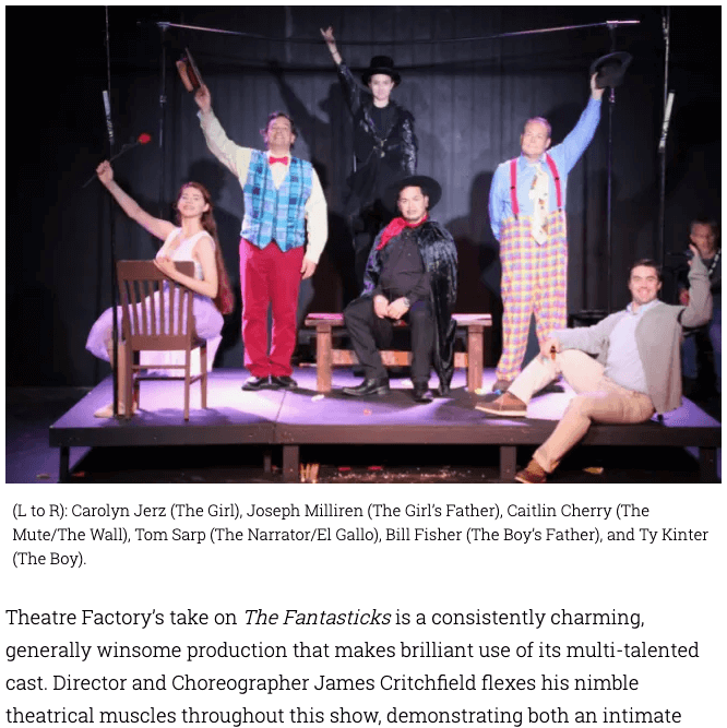 Fantasticks is wonderfully cast across the board, replete with performers whose vocal abilities match their exuberant on-stage presences.