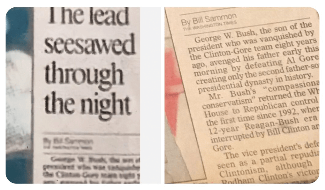 The Twitterverse quickly turned up the real front page, which accurately reported a Bush win. Likewise, the Times (a notably conservative paper which endorsed Trump in 2020) weighted in, saying the image was fake.