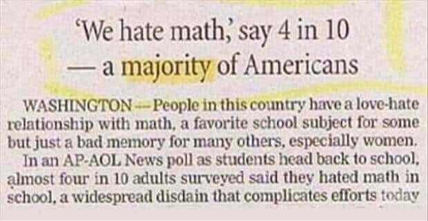 For the record, editors often write their own headlines to fit the available space, or to generate more traffic. Here’s how CNN reported this story (under the headline “The most unpopular school subject“): “Twice as many people said they hated math as said that about any other subject.”
