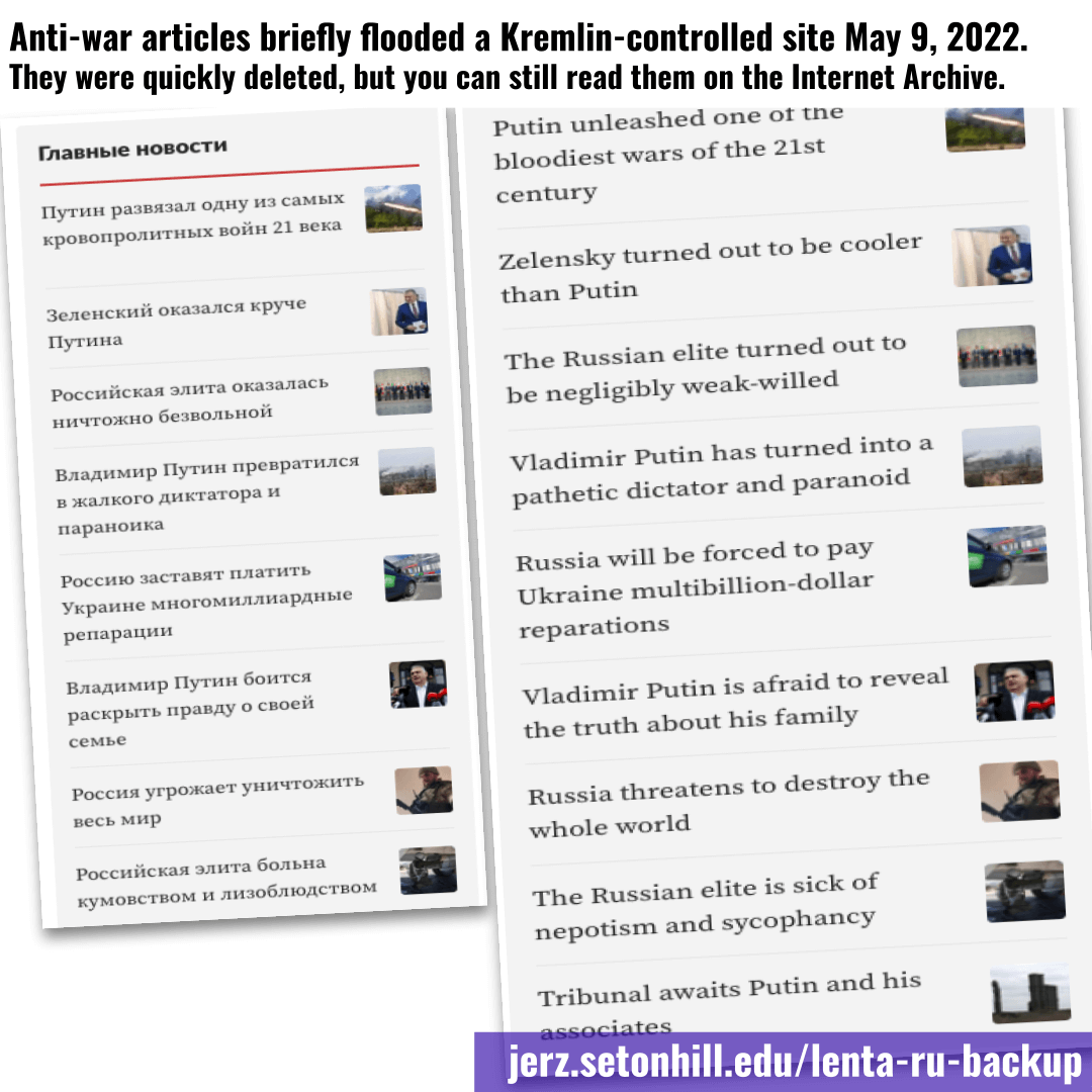 About a dozen reports appeared on Lenta.ru on May 9 at the same time Putin was using the commemoration of the 77th anniversary of the Soviet Union’s role in the defeat of Nazi Germany in 1945 to justify Russia’s war against Ukraine.